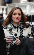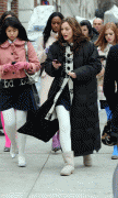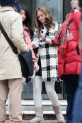 "Gossip Girl" starlet Leighton Meister, snapped out working in white and black winter coat teamed with white leggings On The Set Of "Gossip Girl" in New York, Dec 9th 2008